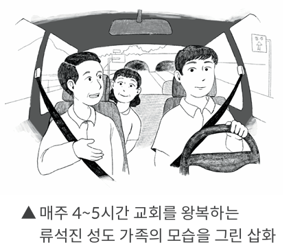 주일마다 예배 참석을 위해 충청북도 청주에서 147km를 달려오는 가족이 있다. 그루터기 류석진 성도 가족이 그 주인공. 주일이면 3명의 식구들은 해도 뜨지 않은 새벽에 일어나 나설 채비를 한다. 아버지 류성춘 성도(27대교구)의 짧은 기도 후 출발하면 보통 오전 6시. 주일 아침 상경에 평균 2시간, 오후 하행에는 2시간 30분, 집에 도착하면 보통 저녁 7~8시가 된다. 오전 6시 출발해 13~14시간 걸리는 대장정이다.